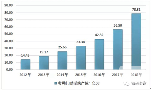 2012-2018年考勤門(mén)禁系統行業(yè)產(chǎn)值規模走勢圖,來(lái)源:智研咨詢(xún)整理