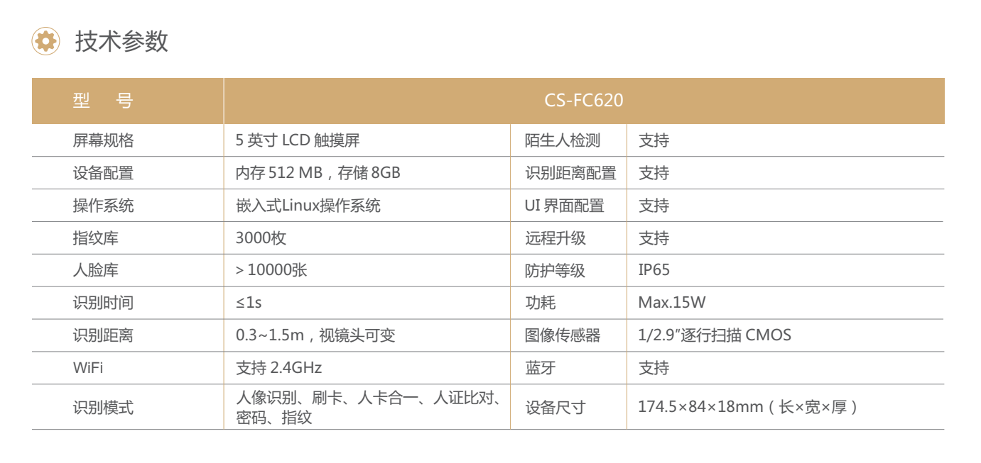 CS-FC620 是一款高性能、高可靠性的人像識別產(chǎn)品,依托深 度 學(xué)習算法,具有識別速度快、準確率高的特點(diǎn)。支持 人像識別, 內置刷卡,指紋識別。 應用場(chǎng)景: 學(xué)校、社區、寫(xiě)字樓、酒店、商場(chǎng)、商店、公共服務(wù)場(chǎng)所等。